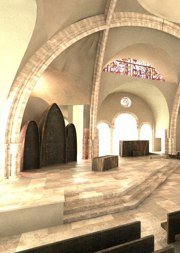 Arcades all around the Church, with enclosures to act as sanctuaries for prayer and meditation External Auditorium Two bell towers.