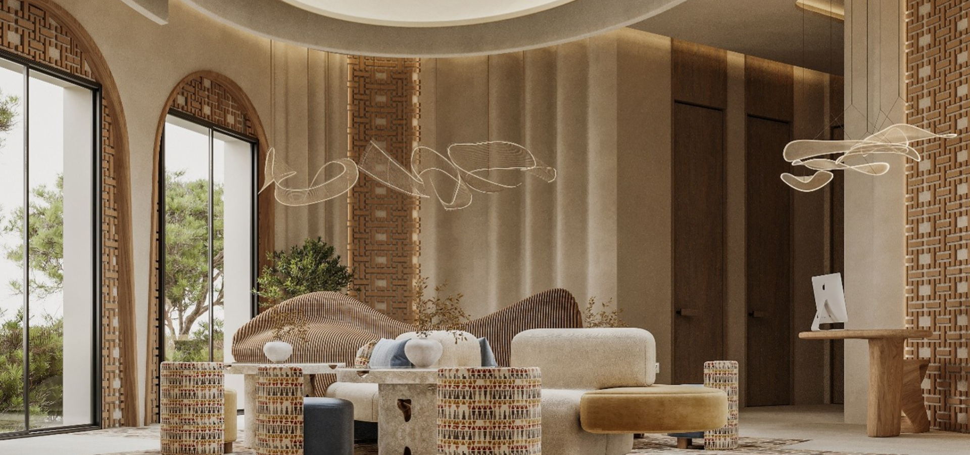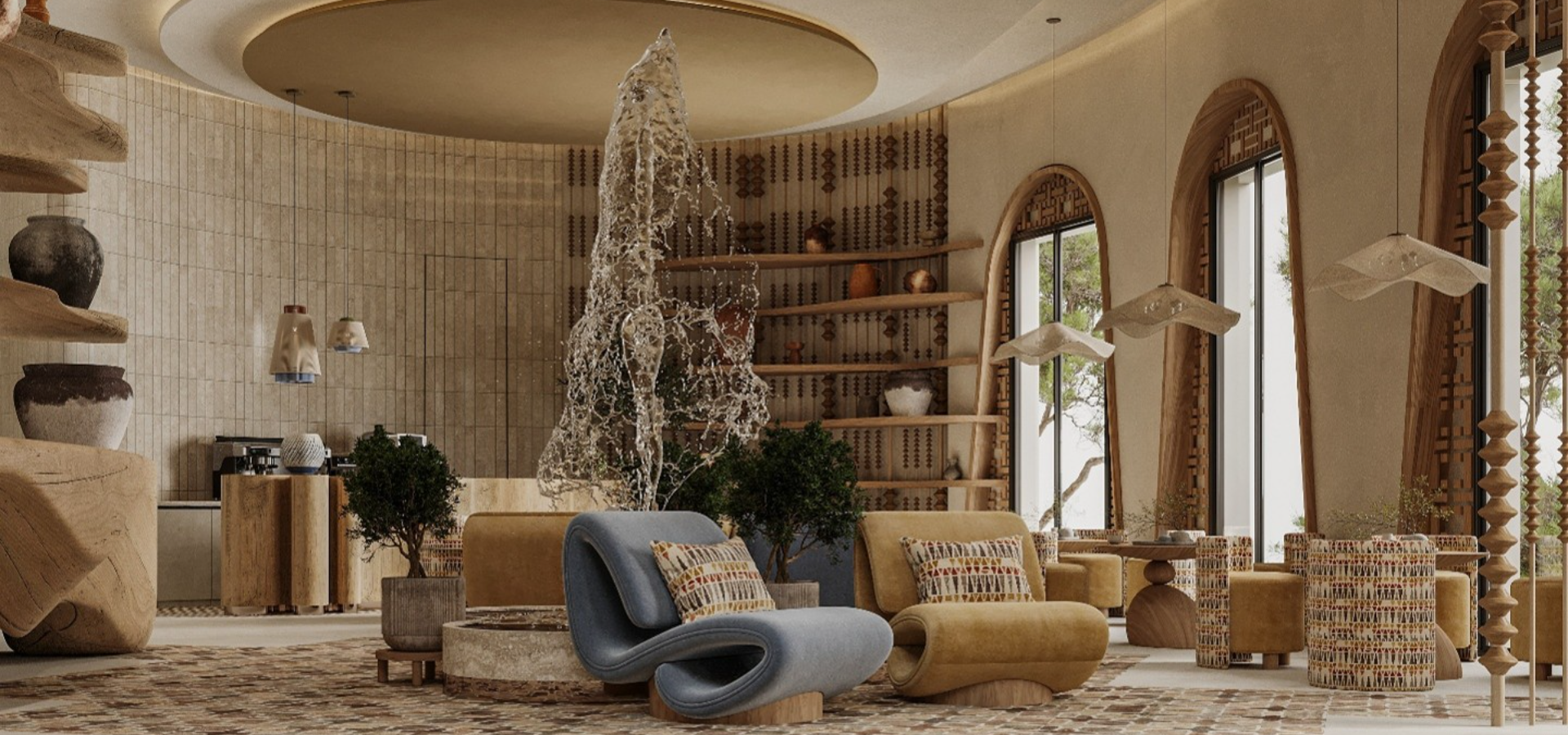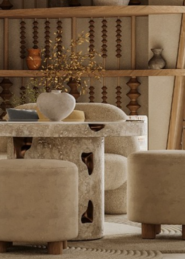 The interior design concept is driven by a warm, textural palette, integrating natural wood, hand-crafted stone, and curated textiles to create inviting and sophisticated spaces. The design emphasizes comfort, authenticity, and a strong sense of place, enhancing the overall guest journey.